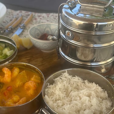 Les plats sont servis dans des boîtes tiffin traditionnelles (dabbas), une façon simple et pratique de présenter les repas à bord.